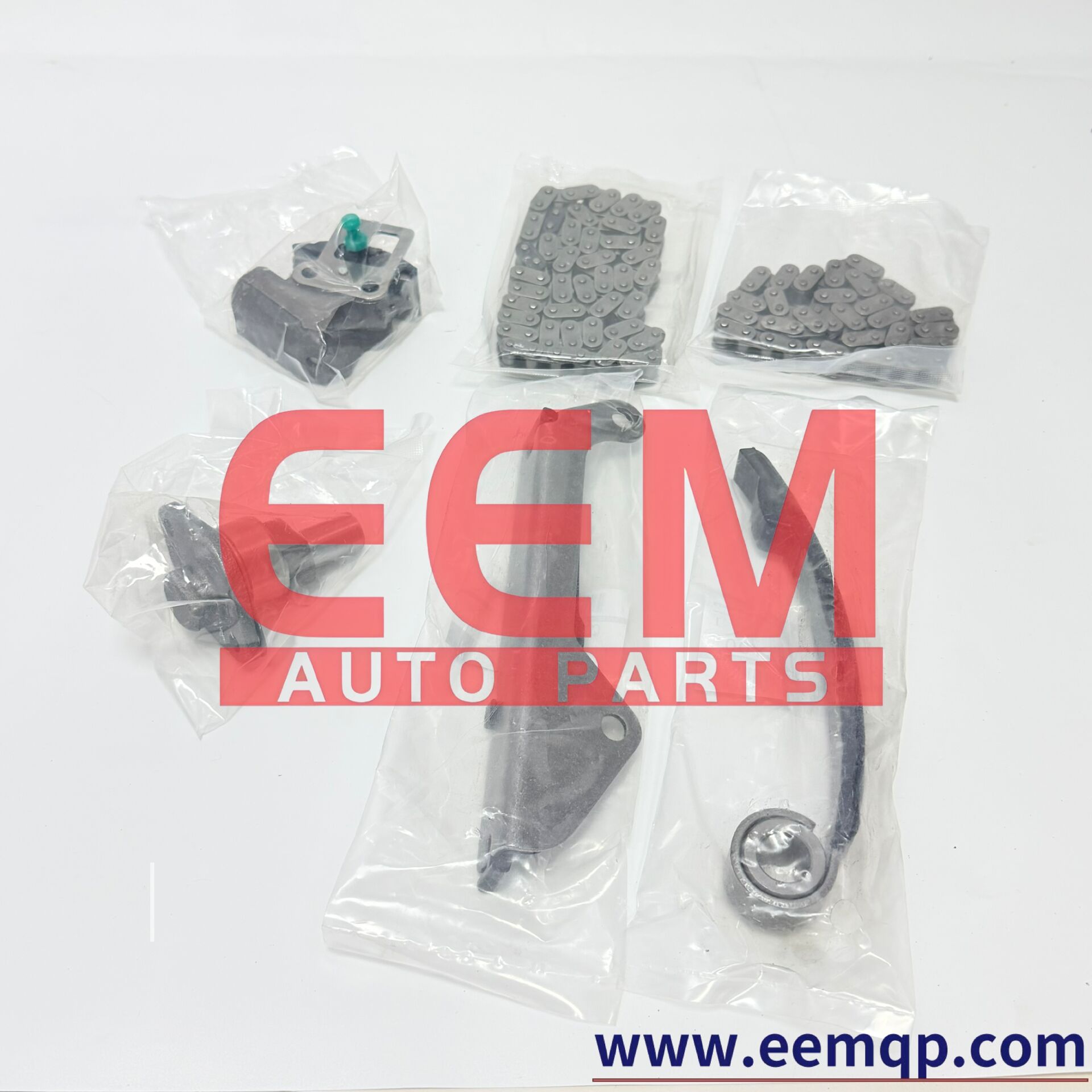 Complete 8-piece set includes 13028-53Y00 (upper timing chain), 13028-55Y10 (lower timing chain), 13070-53Y11 (tensioner), 13085-53Y00 (guide), plus sprockets, idler gear and bolts.
